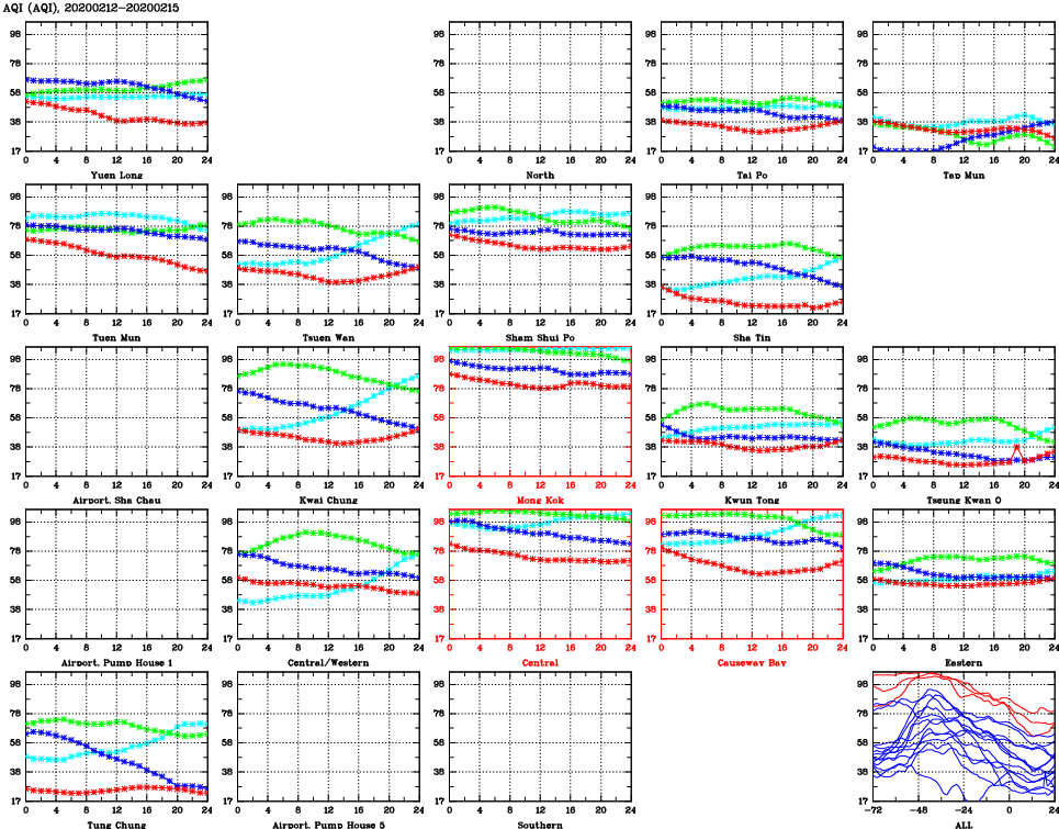 | Air Quality Data Time Series for AQI (2020/02/15) | ( Line colors: Day -3 Day -2 Day -1 Current day ) | 2D Map Current AQHI |