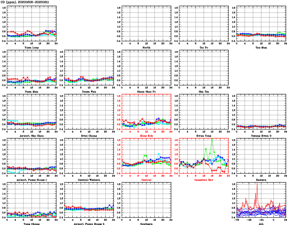 | Air Quality Data Time Series for CO (2020/02/11) | ( Line colors: Day -3 Day -2 Day -1 Current day ) | 2D Map Current AQHI |