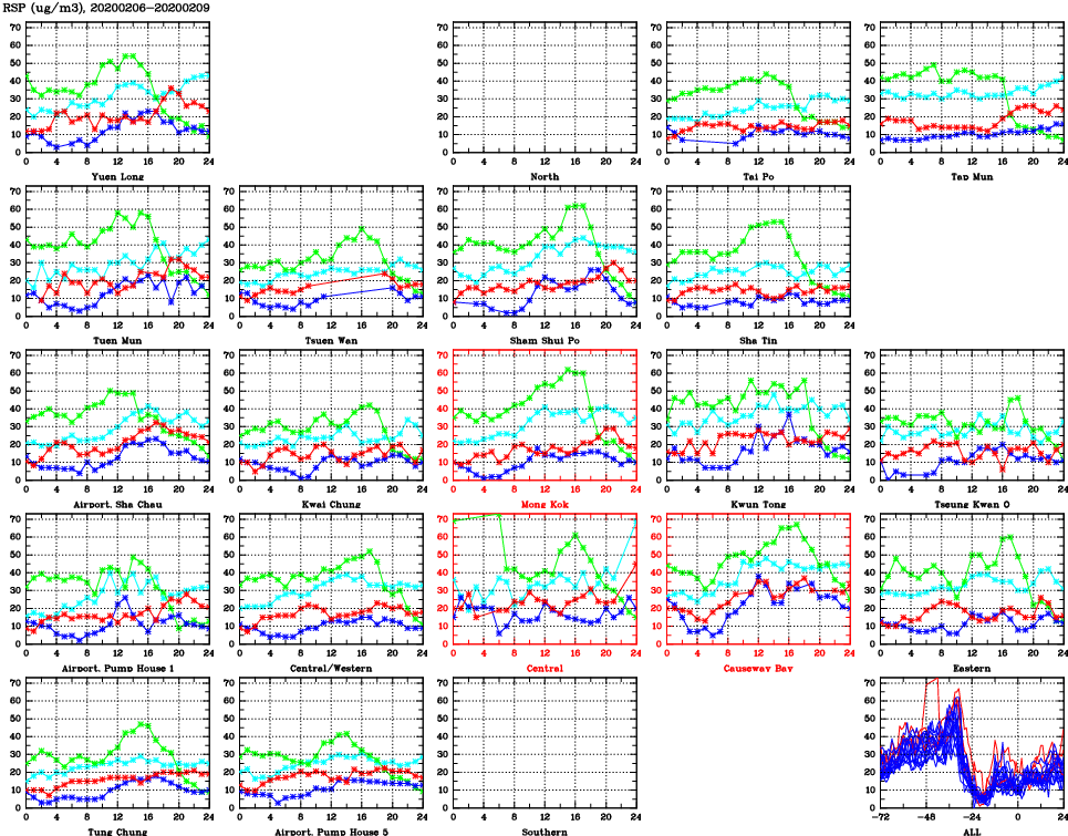 | Air Quality Data Time Series for RSP (2020/02/09) | ( Line colors: Day -3 Day -2 Day -1 Current day ) | 2D Map Current AQHI |