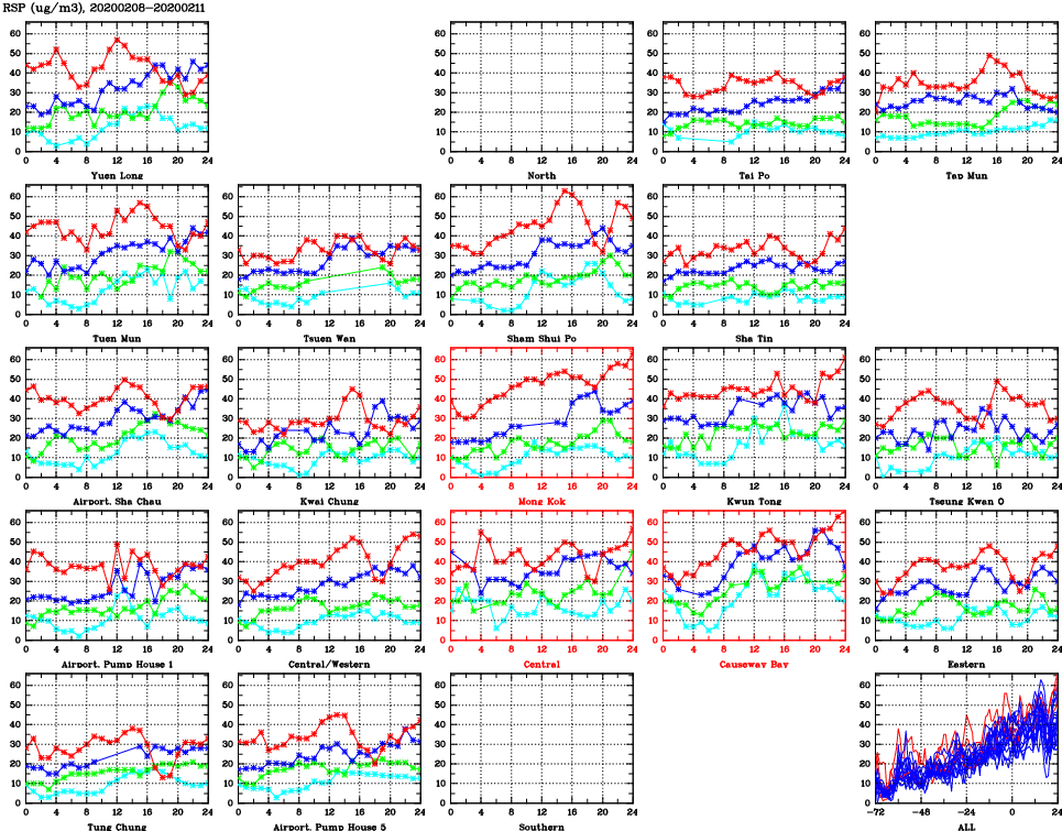 | Air Quality Data Time Series for RSP (2020/02/11) | ( Line colors: Day -3 Day -2 Day -1 Current day ) | 2D Map Current AQHI |