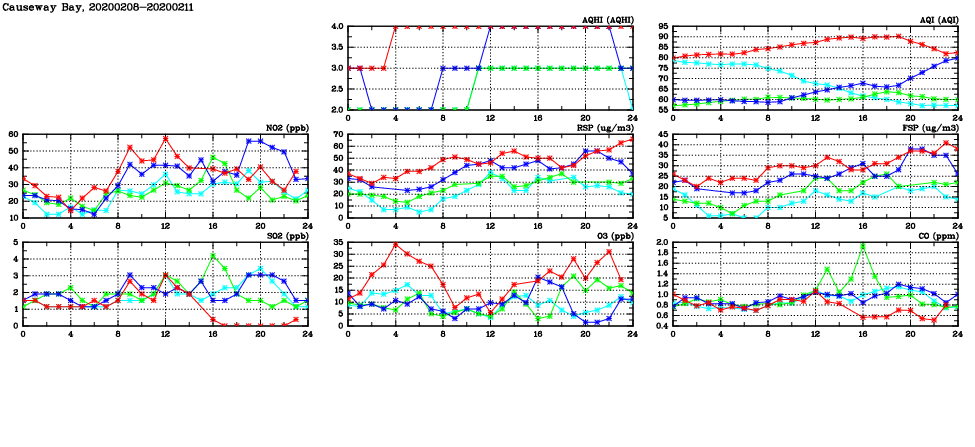 | Air Quality Data Time Series in Causeway Bay (2020/02/11) | ( Line colors: Day -3 Day -2 Day -1 Current day ) | 2D Map Current AQHI |