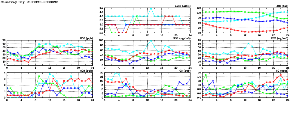 | Air Quality Data Time Series in Causeway Bay (2020/02/15) | ( Line colors: Day -3 Day -2 Day -1 Current day ) | 2D Map Current AQHI |