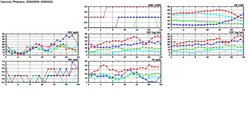 | Air Quality Data Time Series in Central/Western (2020/02/11) | ( Line colors: Day -3 Day -2 Day -1 Current day ) | 2D Map Current AQHI |