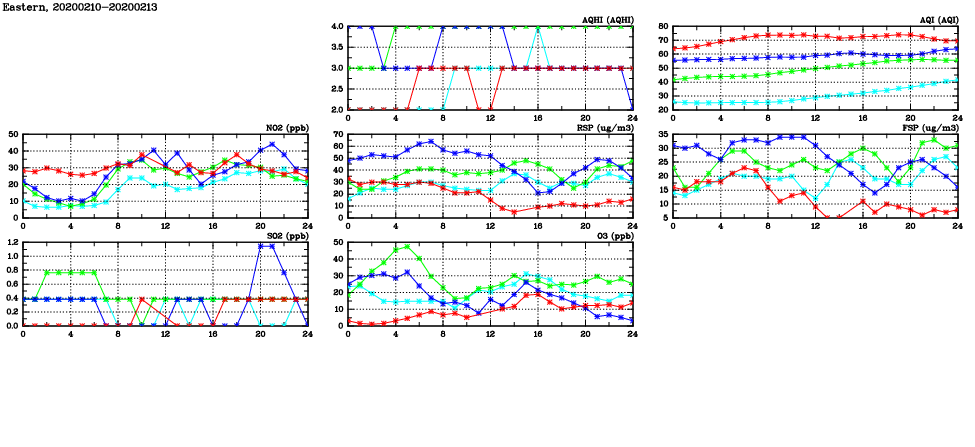 | Air Quality Data Time Series in Eastern (2020/02/13) | ( Line colors: Day -3 Day -2 Day -1 Current day ) | 2D Map Current AQHI |