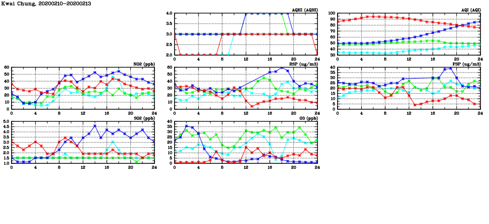 | Air Quality Data Time Series in Kwai Chung (2020/02/13) | ( Line colors: Day -3 Day -2 Day -1 Current day ) | 2D Map Current AQHI |
