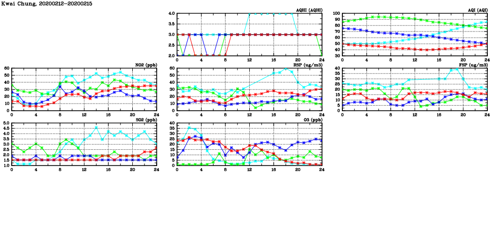 | Air Quality Data Time Series in Kwai Chung (2020/02/15) | ( Line colors: Day -3 Day -2 Day -1 Current day ) | 2D Map Current AQHI |
