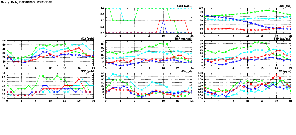 | Air Quality Data Time Series in Mong Kok (2020/02/09) | ( Line colors: Day -3 Day -2 Day -1 Current day ) | 2D Map Current AQHI |