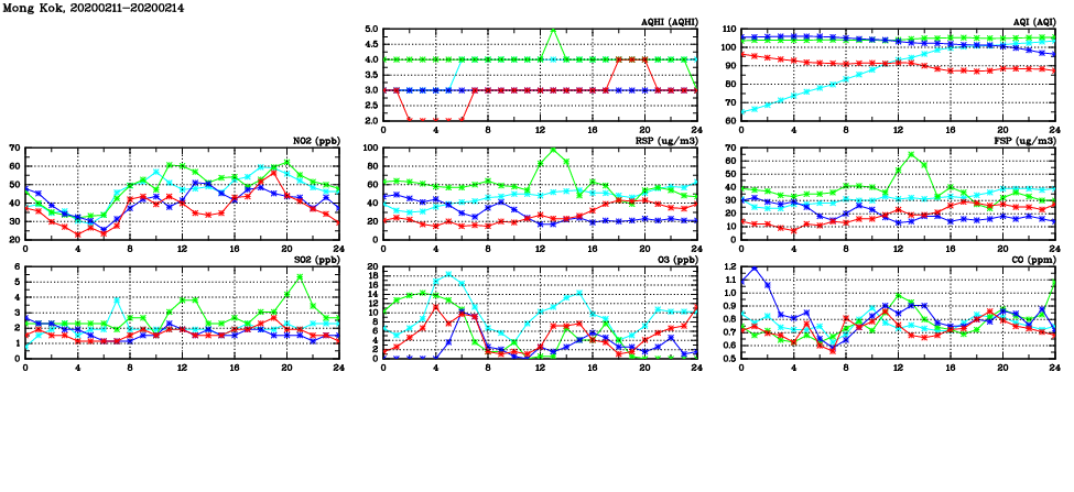 | Air Quality Data Time Series in Mong Kok (2020/02/14) | ( Line colors: Day -3 Day -2 Day -1 Current day ) | 2D Map Current AQHI |