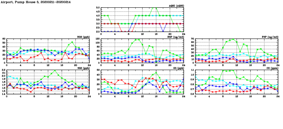 | Air Quality Data Time Series in Airport, Pump House 5 (2020/02/14) | ( Line colors: Day -3 Day -2 Day -1 Current day ) | 2D Map Current AQHI |