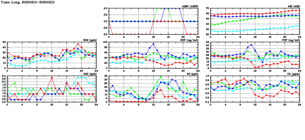 | Air Quality Data Time Series in Yuen Long (2020/02/13) | ( Line colors: Day -3 Day -2 Day -1 Current day ) | 2D Map Current AQHI |