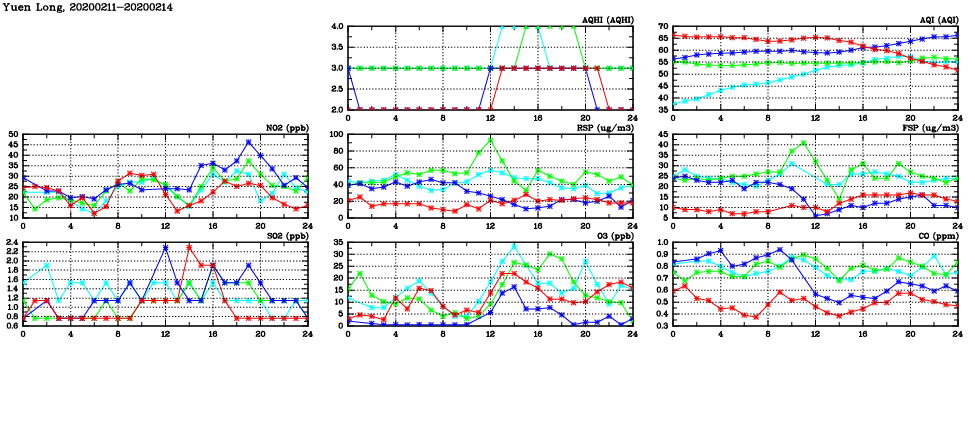 | Air Quality Data Time Series in Yuen Long (2020/02/14) | ( Line colors: Day -3 Day -2 Day -1 Current day ) | 2D Map Current AQHI |