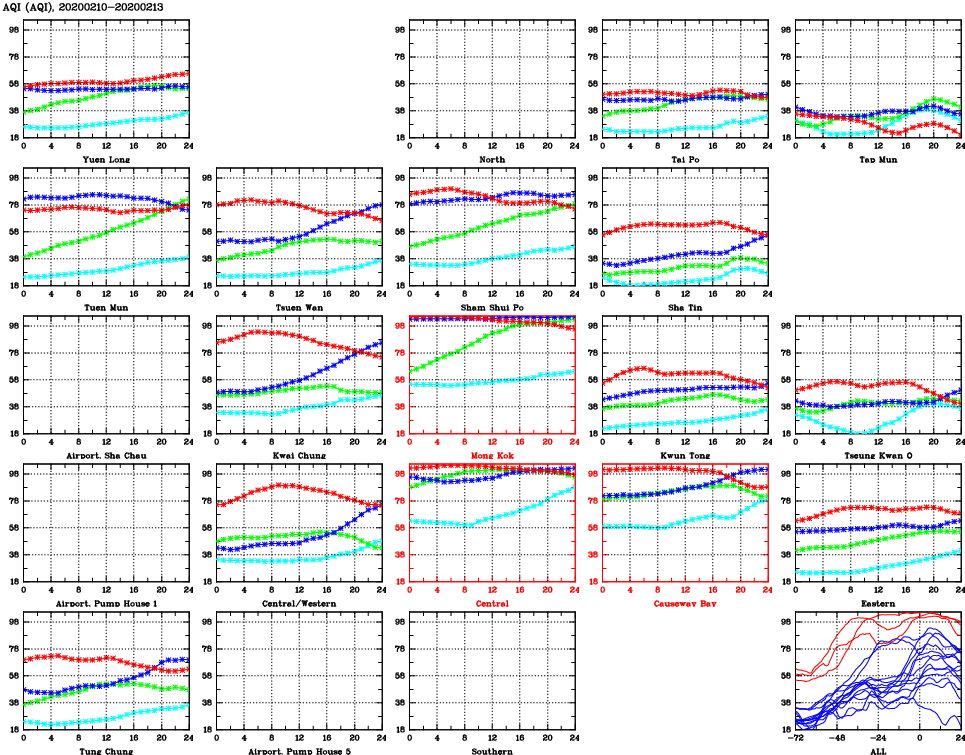| Air Quality Data Time Series for AQI (2020/02/13) | ( Line colors: Day -3 Day -2 Day -1 Current day ) | 2D Map Current AQHI |