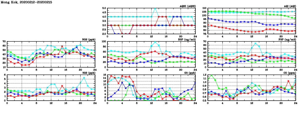 | Air Quality Data Time Series in Mong Kok (2020/02/15) | ( Line colors: Day -3 Day -2 Day -1 Current day ) | 2D Map Current AQHI |