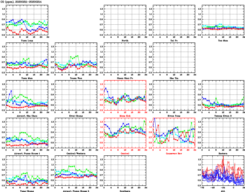 | Air Quality Data Time Series for CO (2020/02/14) | ( Line colors: Day -3 Day -2 Day -1 Current day ) | 2D Map Current AQHI |