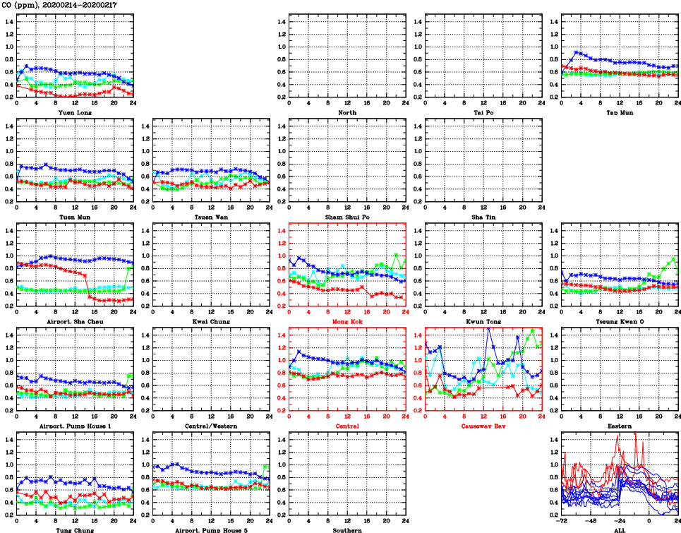 | Air Quality Data Time Series for CO (2020/02/17) | ( Line colors: Day -3 Day -2 Day -1 Current day ) | 2D Map Current AQHI |