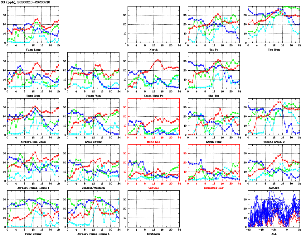 | Air Quality Data Time Series for O3 (2020/02/16) | ( Line colors: Day -3 Day -2 Day -1 Current day ) | 2D Map Current AQHI |