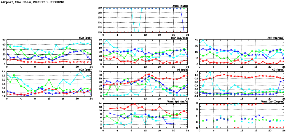 | Air Quality Data Time Series in Airport, Sha Chau (2020/02/16) | ( Line colors: Day -3 Day -2 Day -1 Current day ) | 2D Map Current AQHI |