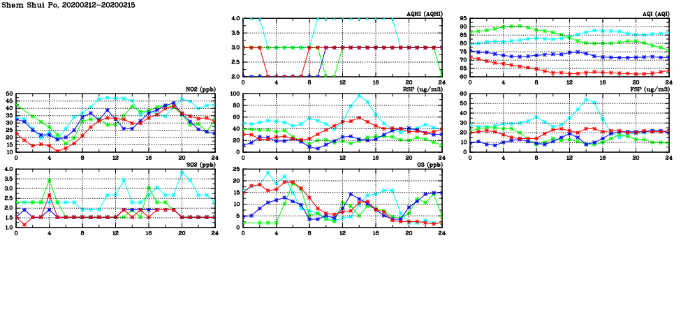 | Air Quality Data Time Series in Sham Shui Po (2020/02/15) | ( Line colors: Day -3 Day -2 Day -1 Current day ) | 2D Map Current AQHI |