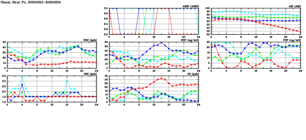 | Air Quality Data Time Series in Sham Shui Po (2020/02/16) | ( Line colors: Day -3 Day -2 Day -1 Current day ) | 2D Map Current AQHI |