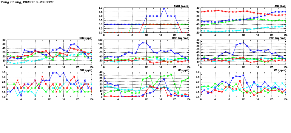 | Air Quality Data Time Series in Tung Chung (2020/02/13) | ( Line colors: Day -3 Day -2 Day -1 Current day ) | 2D Map Current AQHI |