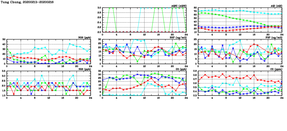 | Air Quality Data Time Series in Tung Chung (2020/02/16) | ( Line colors: Day -3 Day -2 Day -1 Current day ) | 2D Map Current AQHI |