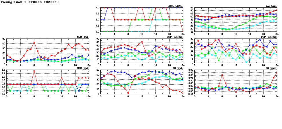 | Air Quality Data Time Series in Tseung Kwan O (2020/02/12) | ( Line colors: Day -3 Day -2 Day -1 Current day ) | 2D Map Current AQHI |