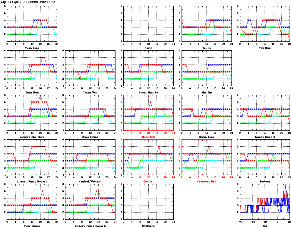 | Air Quality Data Time Series for AQHI (2020/02/12) | ( Line colors: Day -3 Day -2 Day -1 Current day ) | 2D Map Current AQHI |