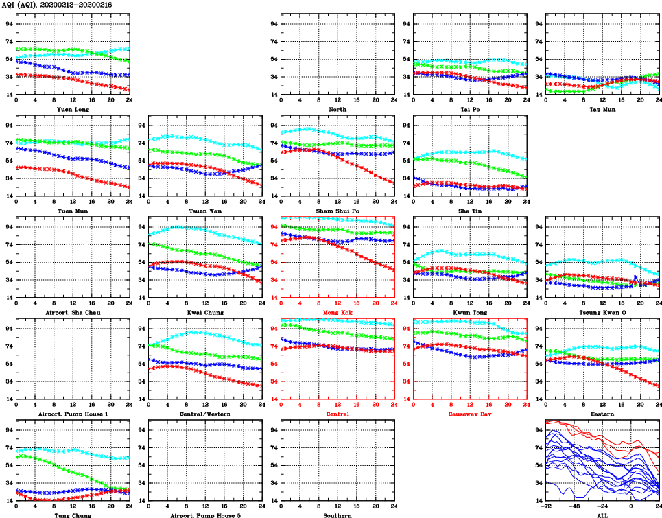 | Air Quality Data Time Series for AQI (2020/02/16) | ( Line colors: Day -3 Day -2 Day -1 Current day ) | 2D Map Current AQHI |