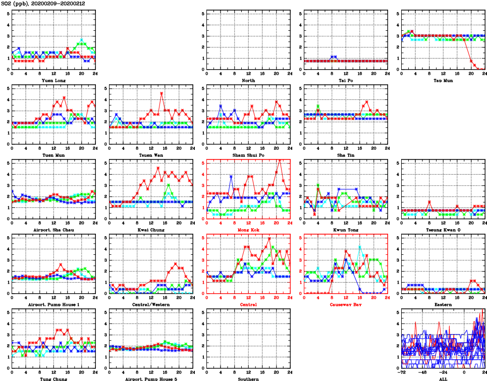 | Air Quality Data Time Series for SO2 (2020/02/12) | ( Line colors: Day -3 Day -2 Day -1 Current day ) | 2D Map Current AQHI |