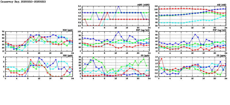 | Air Quality Data Time Series in Causeway Bay (2020/02/13) | ( Line colors: Day -3 Day -2 Day -1 Current day ) | 2D Map Current AQHI |