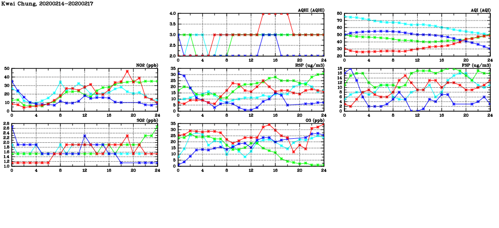 | Air Quality Data Time Series in Kwai Chung (2020/02/17) | ( Line colors: Day -3 Day -2 Day -1 Current day ) | 2D Map Current AQHI |