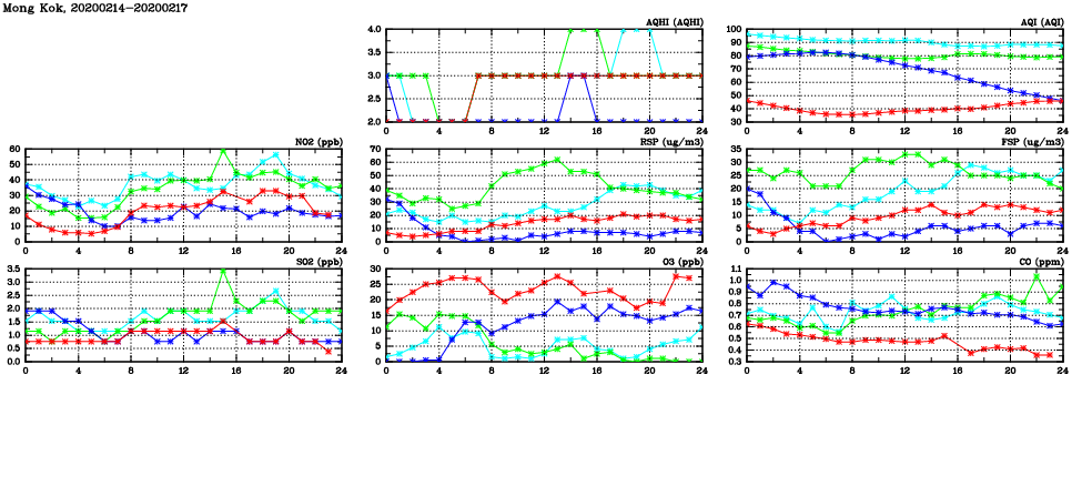 | Air Quality Data Time Series in Mong Kok (2020/02/17) | ( Line colors: Day -3 Day -2 Day -1 Current day ) | 2D Map Current AQHI |