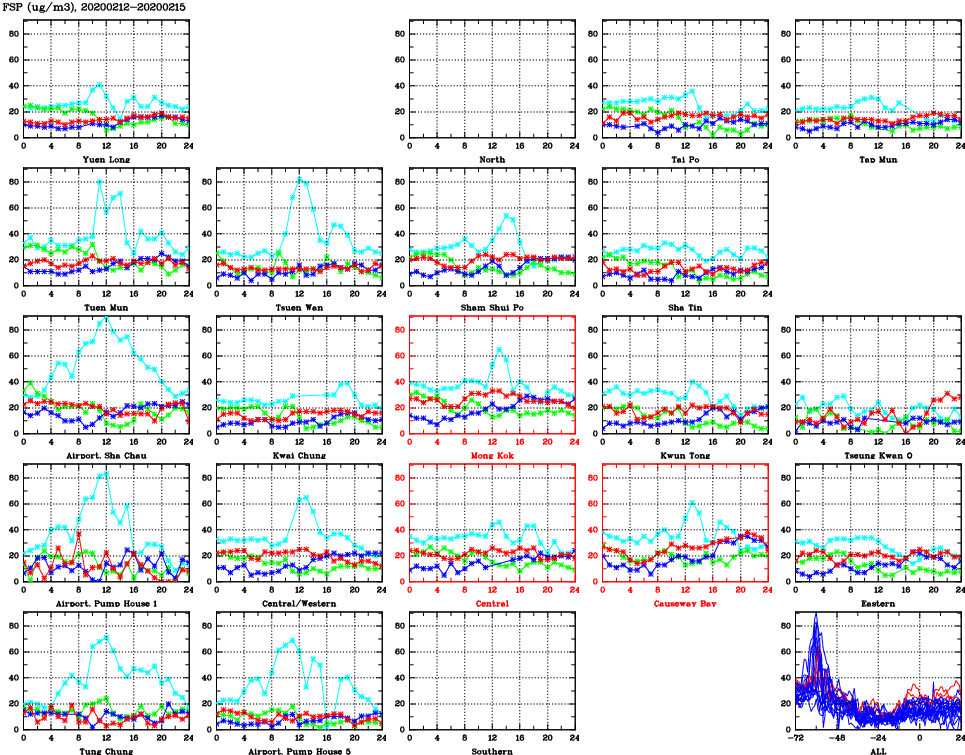 | Air Quality Data Time Series for FSP (2020/02/15) | ( Line colors: Day -3 Day -2 Day -1 Current day ) | 2D Map Current AQHI |