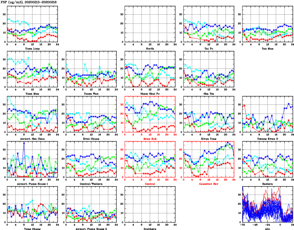 | Air Quality Data Time Series for FSP (2020/02/16) | ( Line colors: Day -3 Day -2 Day -1 Current day ) | 2D Map Current AQHI |