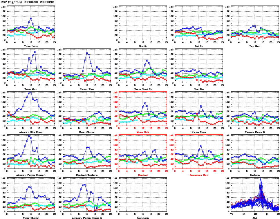 | Air Quality Data Time Series for RSP (2020/02/13) | ( Line colors: Day -3 Day -2 Day -1 Current day ) | 2D Map Current AQHI |