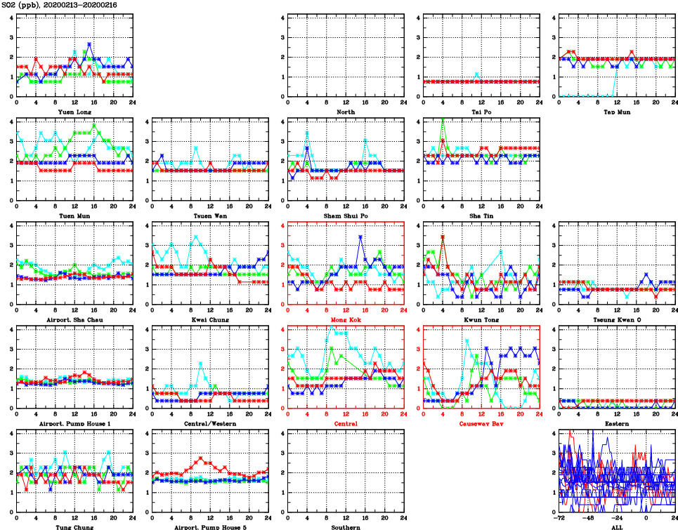 | Air Quality Data Time Series for SO2 (2020/02/16) | ( Line colors: Day -3 Day -2 Day -1 Current day ) | 2D Map Current AQHI |
