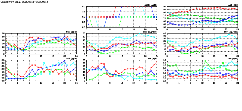 | Air Quality Data Time Series in Causeway Bay (2020/02/18) | ( Line colors: Day -3 Day -2 Day -1 Current day ) | 2D Map Current AQHI |