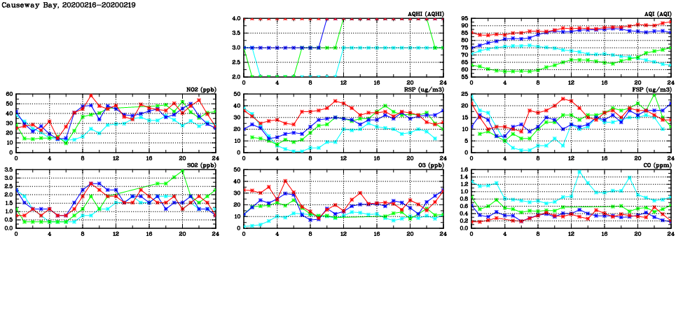 | Air Quality Data Time Series in Causeway Bay (2020/02/19) | ( Line colors: Day -3 Day -2 Day -1 Current day ) | 2D Map Current AQHI |