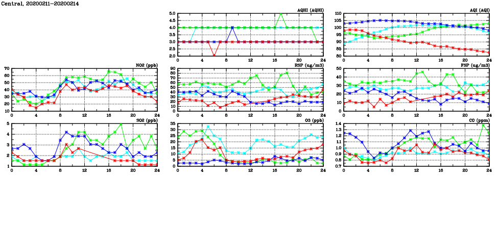 | Air Quality Data Time Series in Central (2020/02/14) | ( Line colors: Day -3 Day -2 Day -1 Current day ) | 2D Map Current AQHI |