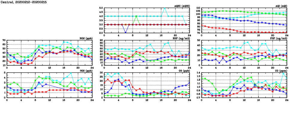 | Air Quality Data Time Series in Central (2020/02/15) | ( Line colors: Day -3 Day -2 Day -1 Current day ) | 2D Map Current AQHI |