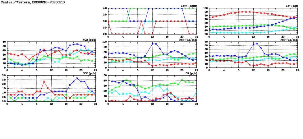 | Air Quality Data Time Series in Central/Western (2020/02/13) | ( Line colors: Day -3 Day -2 Day -1 Current day ) | 2D Map Current AQHI |
