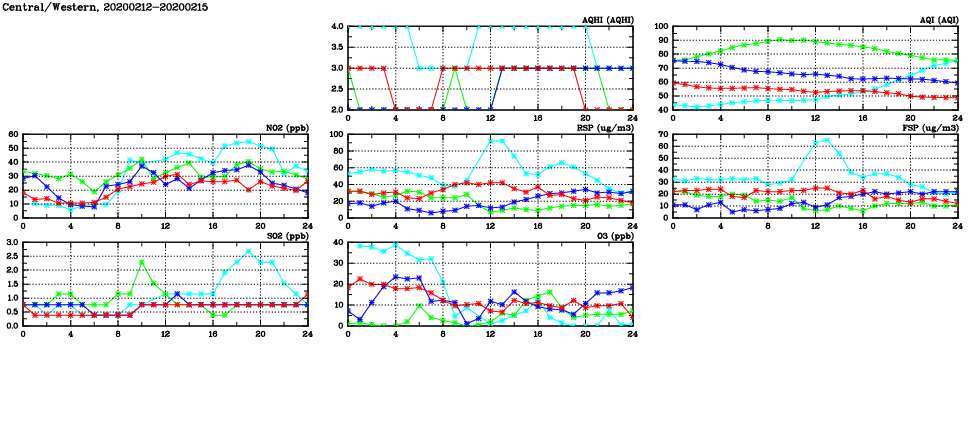 | Air Quality Data Time Series in Central/Western (2020/02/15) | ( Line colors: Day -3 Day -2 Day -1 Current day ) | 2D Map Current AQHI |