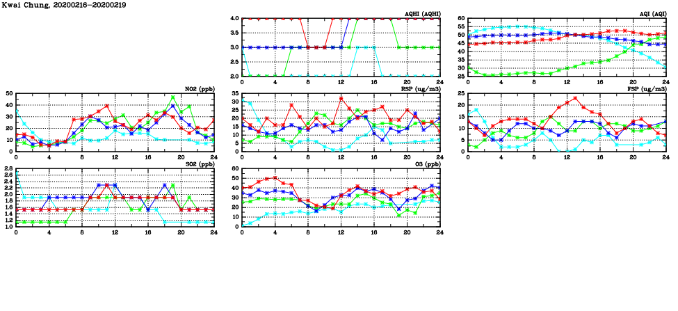 | Air Quality Data Time Series in Kwai Chung (2020/02/19) | ( Line colors: Day -3 Day -2 Day -1 Current day ) | 2D Map Current AQHI |