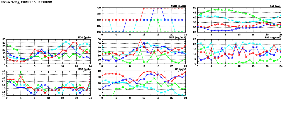 | Air Quality Data Time Series in Kwun Tong (2020/02/18) | ( Line colors: Day -3 Day -2 Day -1 Current day ) | 2D Map Current AQHI |
