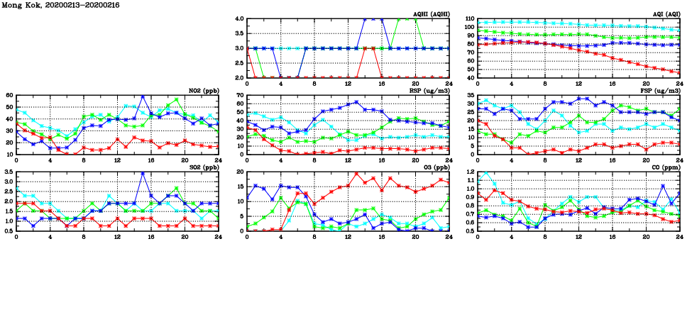 | Air Quality Data Time Series in Mong Kok (2020/02/16) | ( Line colors: Day -3 Day -2 Day -1 Current day ) | 2D Map Current AQHI |
