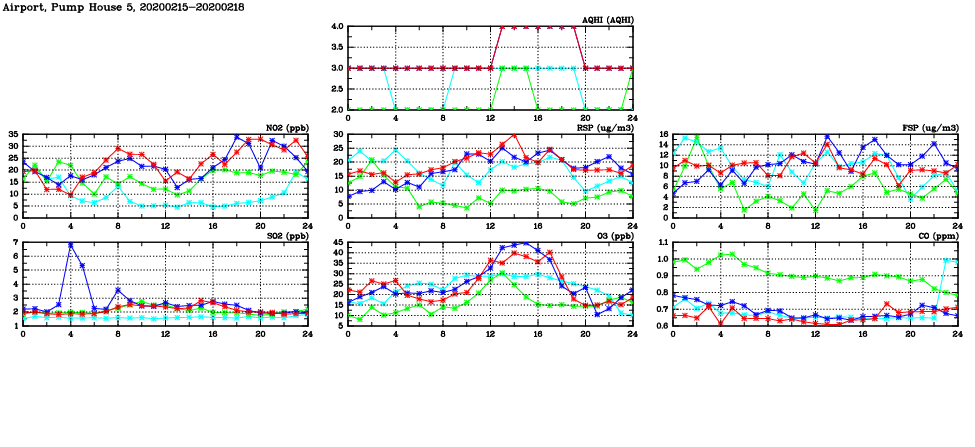 | Air Quality Data Time Series in Airport, Pump House 5 (2020/02/18) | ( Line colors: Day -3 Day -2 Day -1 Current day ) | 2D Map Current AQHI |