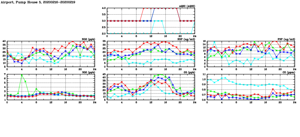 | Air Quality Data Time Series in Airport, Pump House 5 (2020/02/19) | ( Line colors: Day -3 Day -2 Day -1 Current day ) | 2D Map Current AQHI |