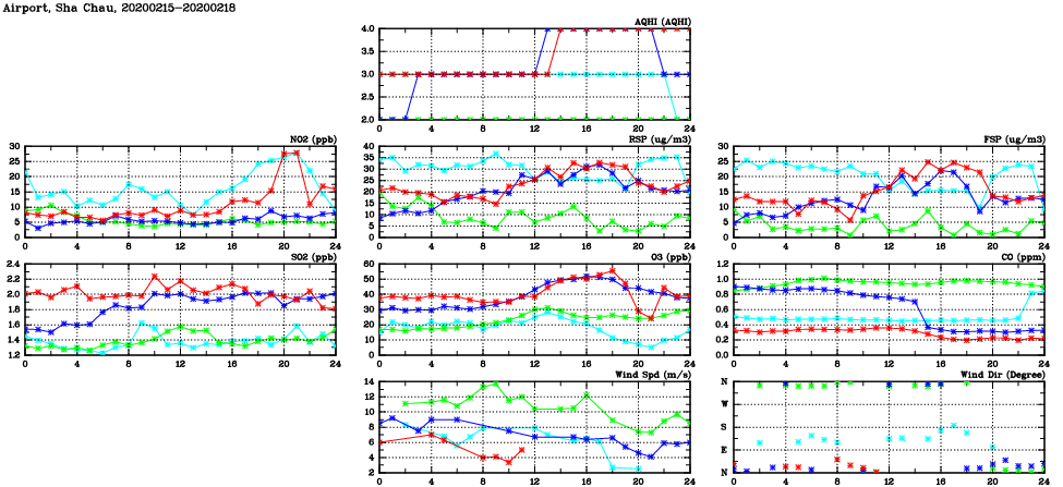 | Air Quality Data Time Series in Airport, Sha Chau (2020/02/18) | ( Line colors: Day -3 Day -2 Day -1 Current day ) | 2D Map Current AQHI |