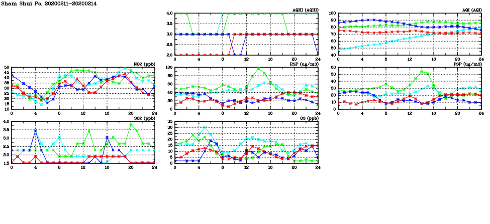 | Air Quality Data Time Series in Sham Shui Po (2020/02/14) | ( Line colors: Day -3 Day -2 Day -1 Current day ) | 2D Map Current AQHI |