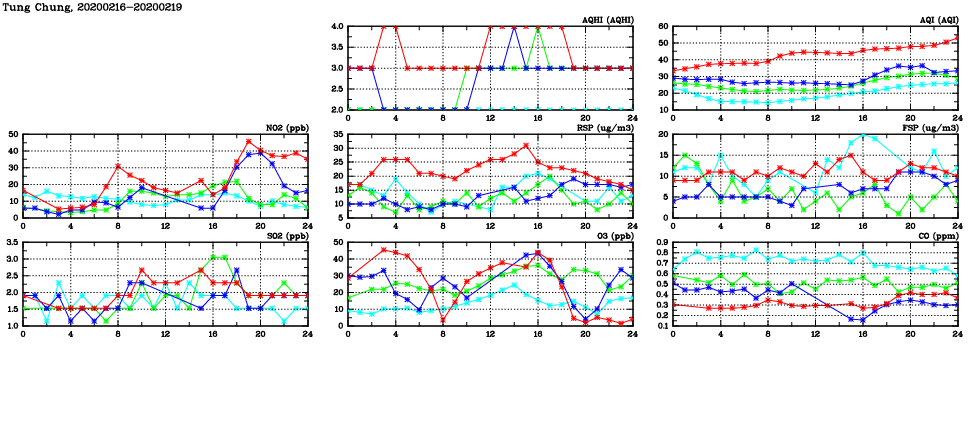 | Air Quality Data Time Series in Tung Chung (2020/02/19) | ( Line colors: Day -3 Day -2 Day -1 Current day ) | 2D Map Current AQHI |